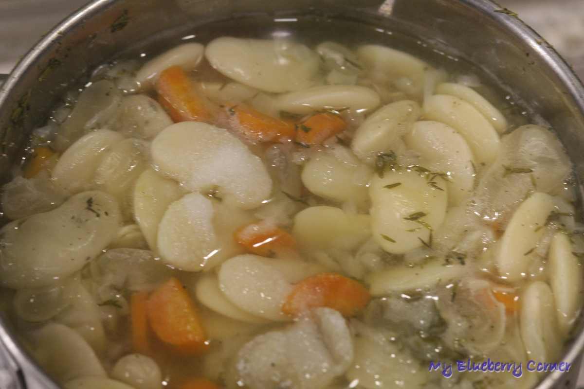 Odcedzić, zalać ponownie ok. 1½ l wody. Marchewkę i cebulę obrać, pokroić – marchewkę w półplasterki, cebulę w kostkę i dodać razem z tymiankiem do fasoli.