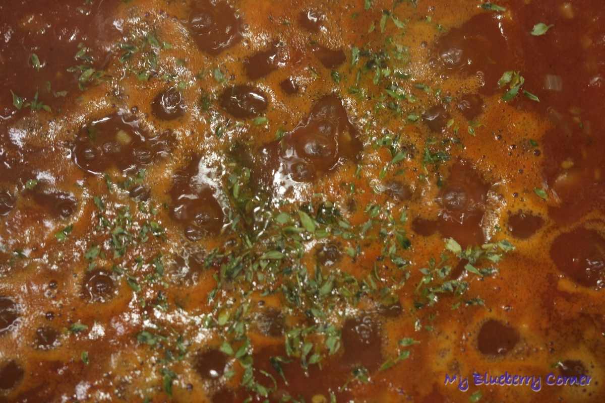Dusić wszystko przez 3-4 minuty. Pomidory drobno pokroić, przełożyć do garnka, dodać obskubane świeże listki tymianku, gotować ½ godziny na wolnym ogniu, aż sos zgęstnieje.