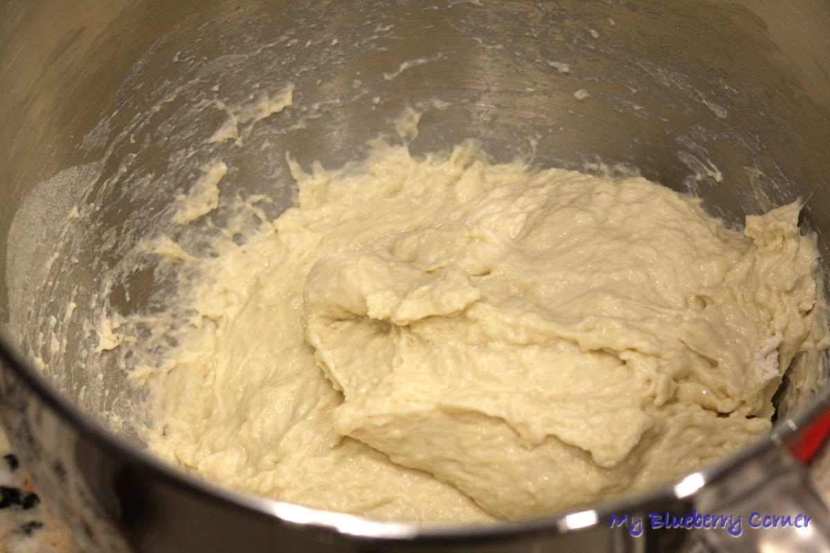 Wszystko wymieszać maszyną z hakiem lub po prostu ręką do czasu, aż składniki się połączą w jednolitą masę.