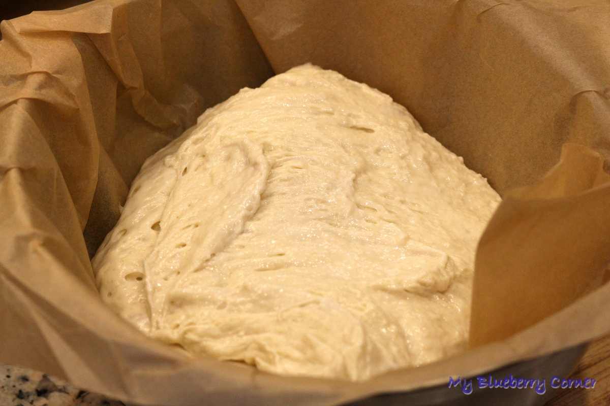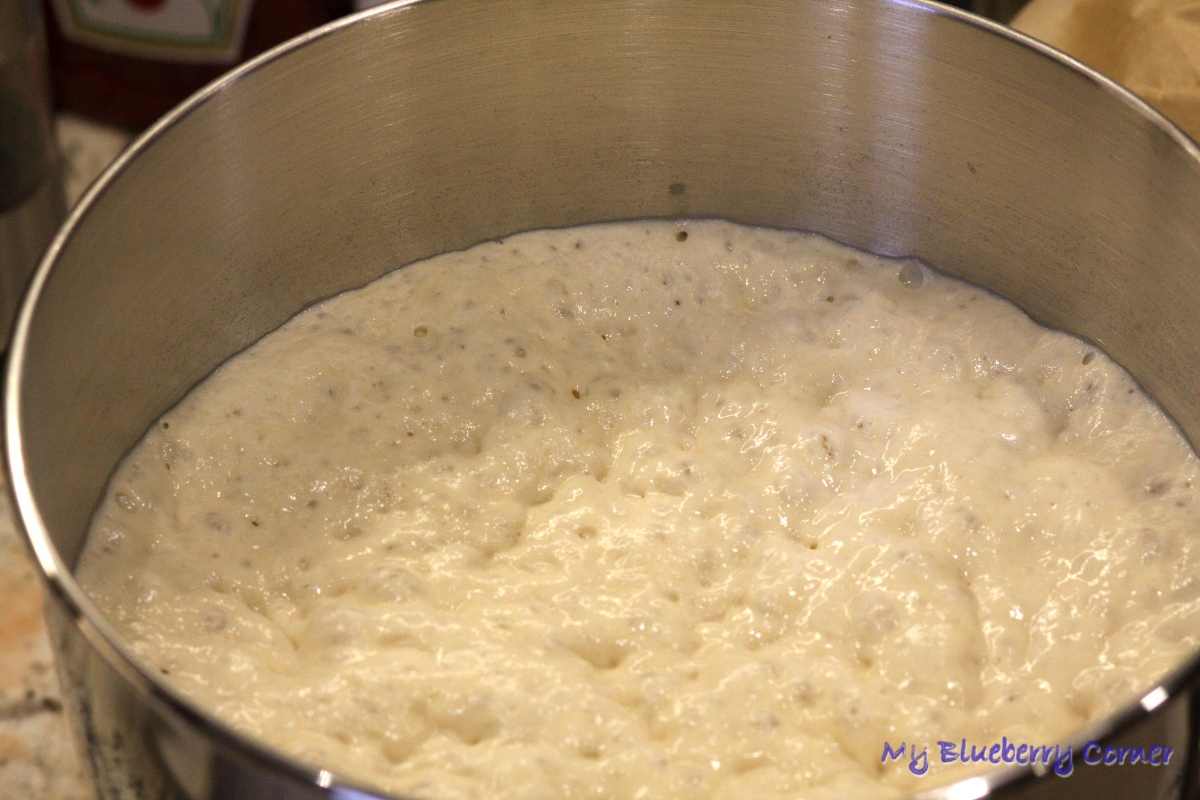 Miskę z ciastem przykryć folią spożywczą i odstawić na 12 godzin w temperaturze 18 – 21°C (teraz, zimą stawiam miskę na parapecie, niedaleko okna, latem ciasto do wyrośnięcia będę znosić do piwnicy). Rano ciasto co najmniej podwoi swoją objętość (może wyrosnąć jeszcze bardziej).
