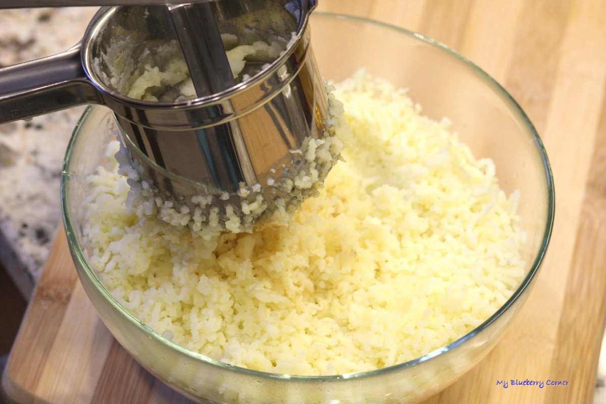 Odlać wodę, ziemniaki i selera przecisnąć przez praskę.