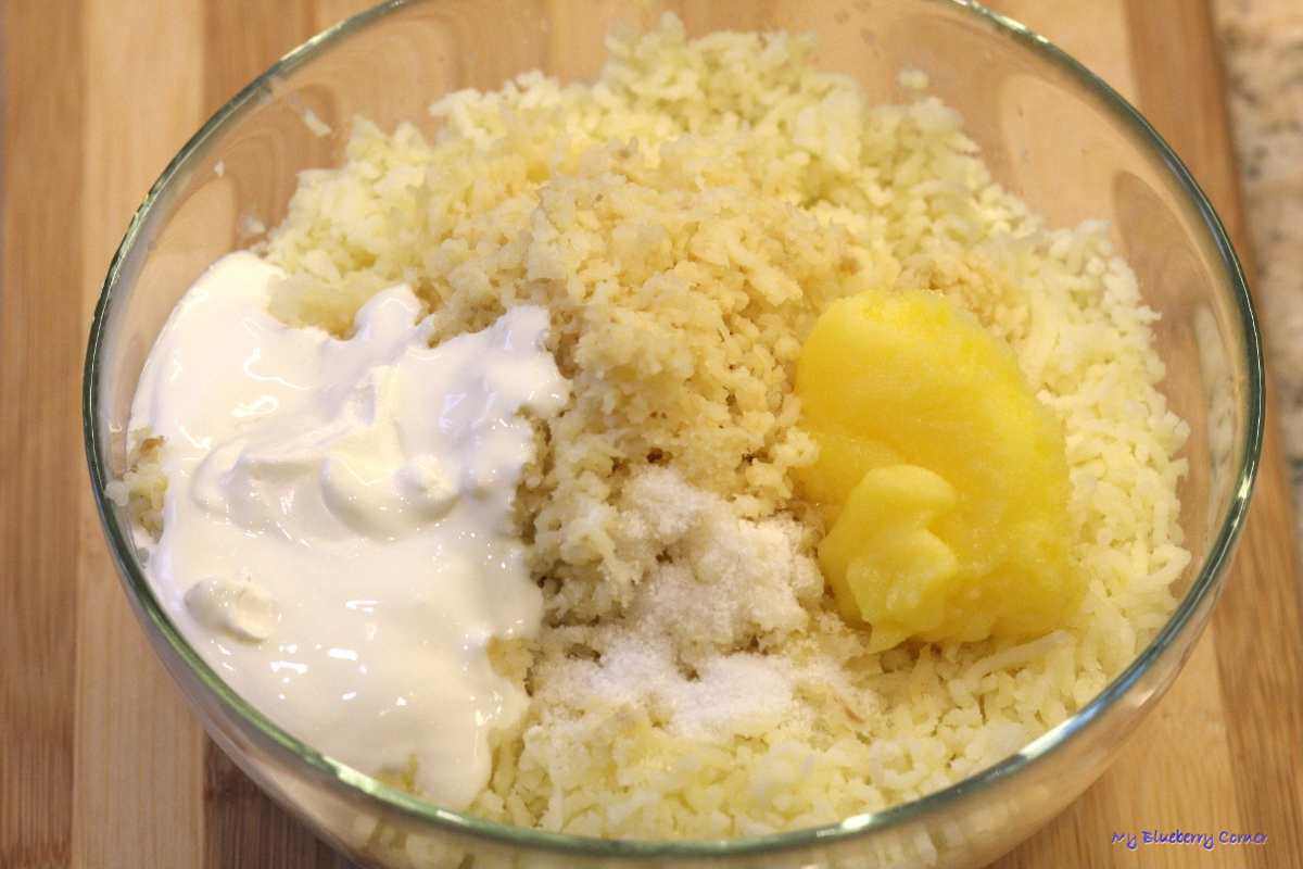 Dodać sól, masło klarowane, śmietanę lub jogurt i mleko.
