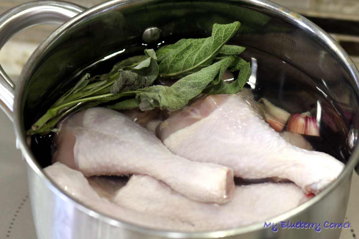 Nogi kurczaka oczyścić z ewentualnych piór i przełożyć do garnka. Dodać szałwię, sól i przekrojone na pół, nieobrane ząbki czosnku. Wszystko zalać wodą i gotować przez ok. 30 minut.