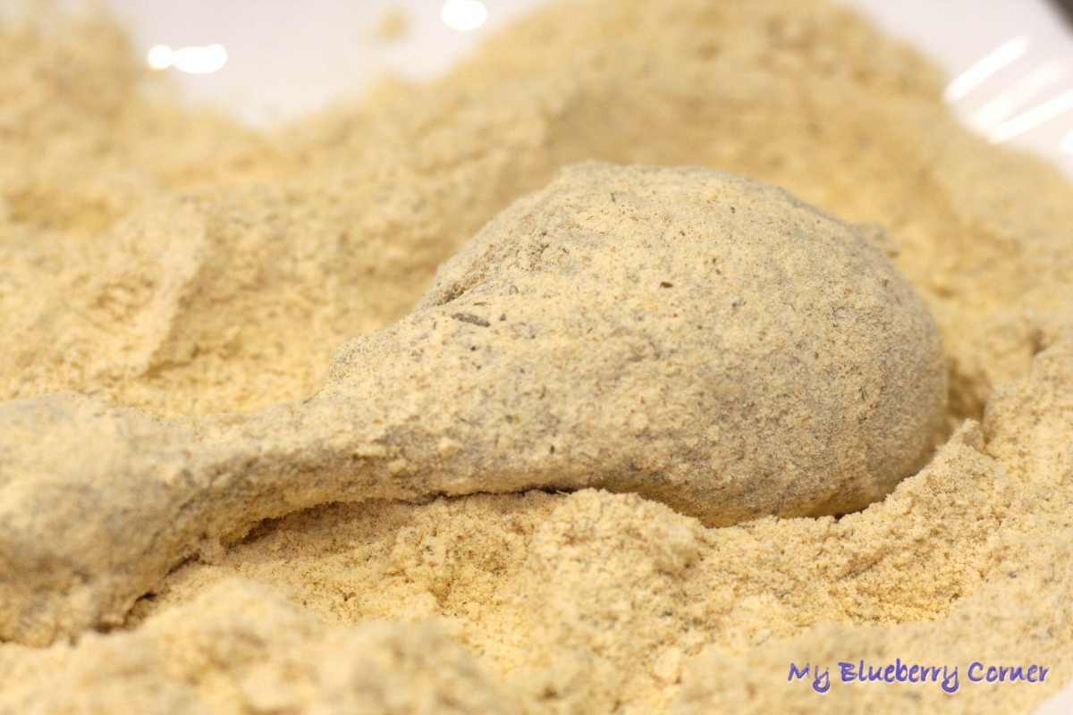 Panierkę wysypać na głęboki talerz, na drugi wlać mleko. W niedużym, ale głębokim garnku czy rondelku rozgrzać olej (oleju nie powinno być więcej niż połowę garnka). Nogi najpierw maczać w mieszance mąki z przyprawami, potem w mleku i jeszcze raz w mące.