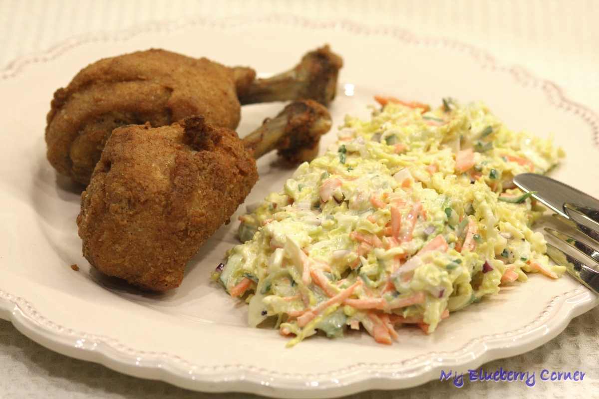 Smażyć nogi, każdą przez 5 minut, odkładać na chwilę na ręcznik papierowy, w celu odsączenia nadmiaru tłuszczu. Chrupiący kurczak najlepiej smakuje na gorąco z colesławem – pyszną surówką z kapusty.
