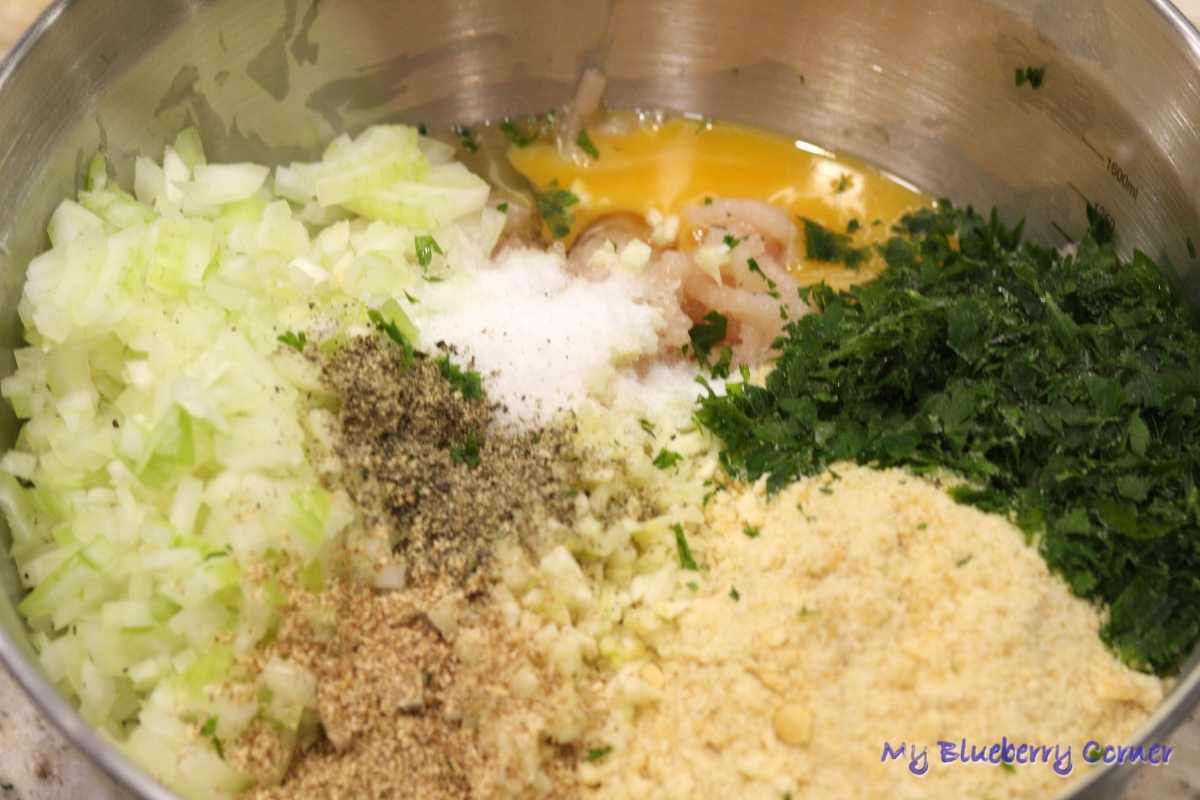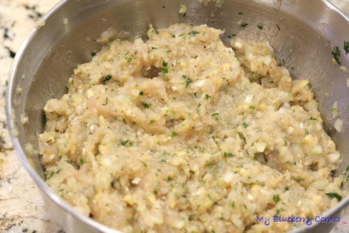Czosnek i cebulę obrać posiekać jak najdrobniej. Wszystko przełożyć do miski, dodać jajko, przyprawy, posiekane listki natki i wodę.
