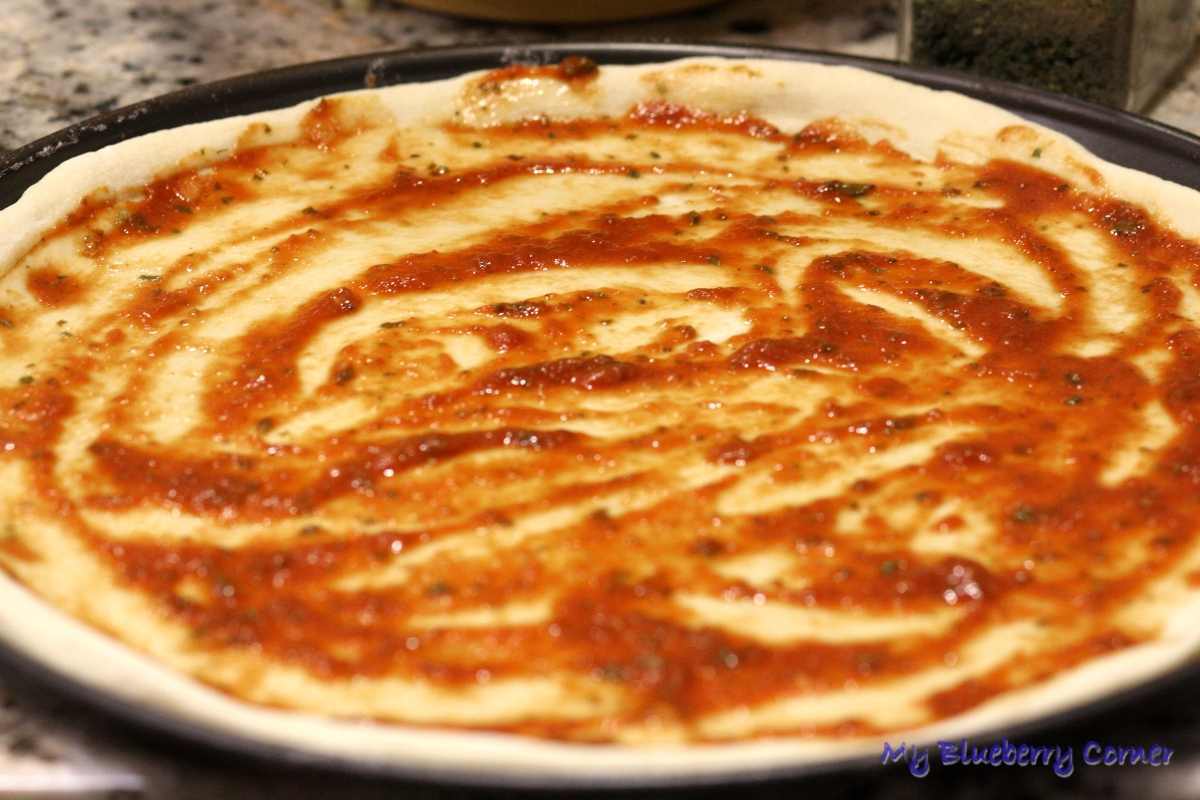 Ciasto posmarować 2-3 łyżkami sosu pomidorowego.