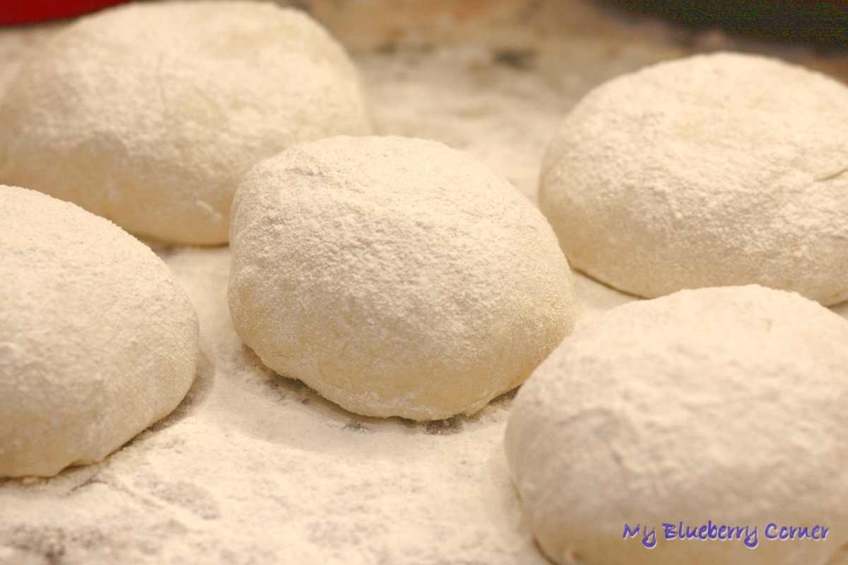 Piekarnik rozgrzać do maksymalnej temperatury (u mnie 275°C). Wyrośnięte ciasto wyjąć na blat, podzielić na 5 części (ja odważam na wadze).