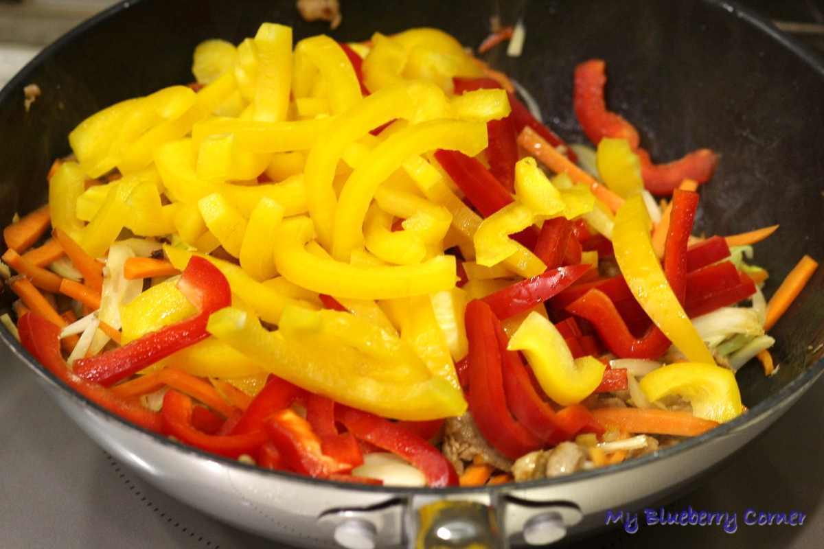 Chwilę przesmażyć, dodać cebulę i paprykę.