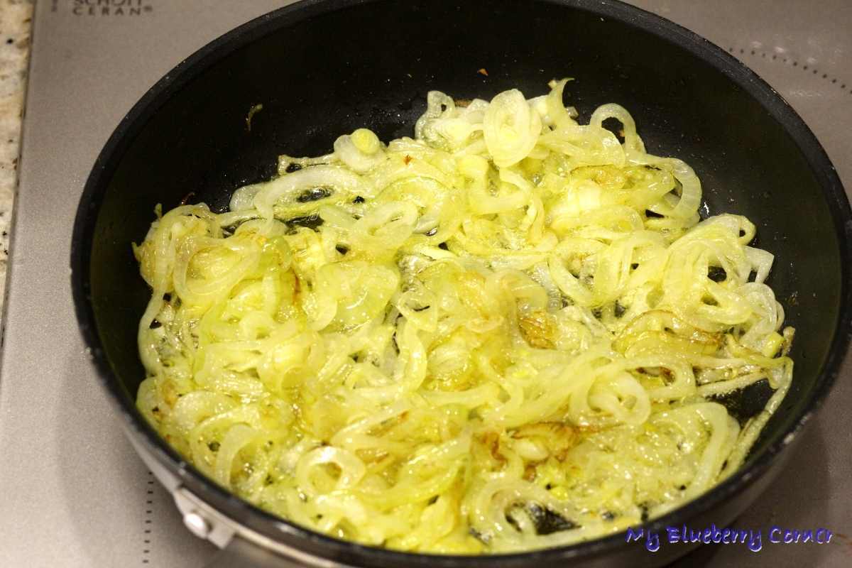 Cebule obrać i pokroić w cienkie plasterki. Na średniej wielkości patelni rozgrzać oliwę z oliwek. Dodać cebulę, smażyć na średnim ogniu, aż cebula się zarumieni.