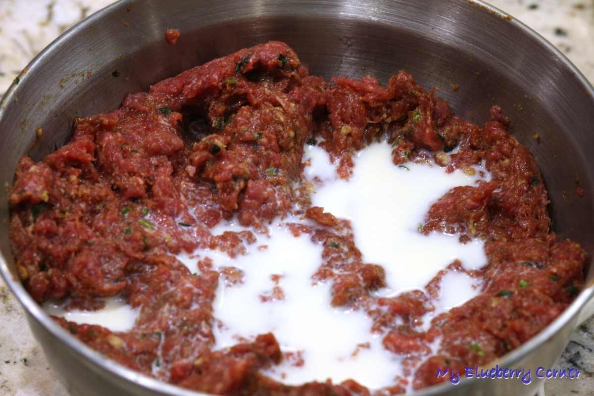 Przygotować pastę z ancho chili z tego przepisu. Odłożyć 6 łyżek pasty, która będzie potrzebna do przygotowania kotletów. Piekarnik rozgrzać do 200 °C w termoobiegu. Chleb namoczyć w mleku. Mięso zmielić. Chleb delikatnie odcisnąć i również zmielić. Dodać jajko, sól, posiekaną kolendrę i 6 łyżek przygotowanej pasty z chili.
