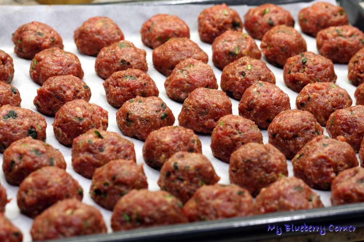Na dużej, wyłożonej papierem do pieczenia blasze ułożyć mięsne kulki wielkości piłek pingpongowych i wstawić do gorącego piekarnika na 25 minut.
