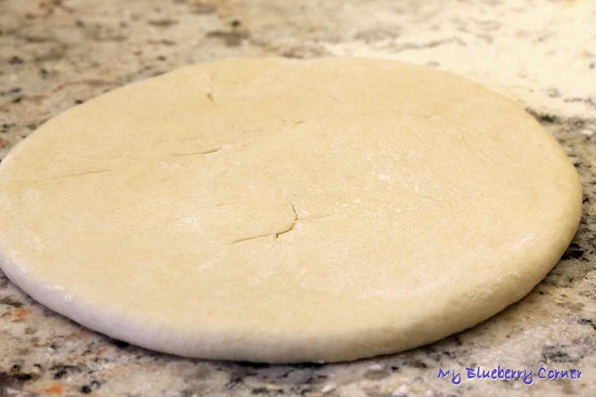 Oprószyć mąką, delikatnie uformować kulę i rozwałkować na placek wielkości patelni, na której będziemy smażyć chaczapuri.