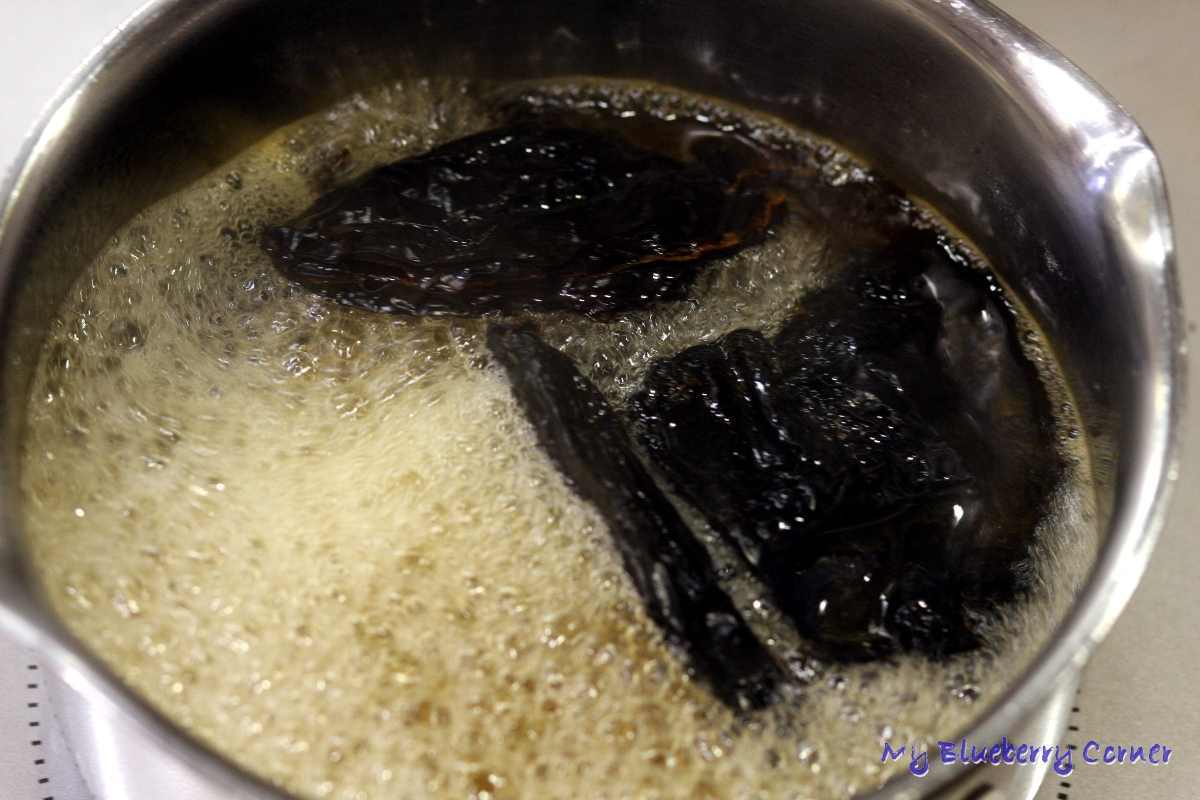 Przełożyć chili do garnka i zalać je wodą. Wodę z paprykami zagotować, wyłączyć grzanie i odstawić na 15 minut.