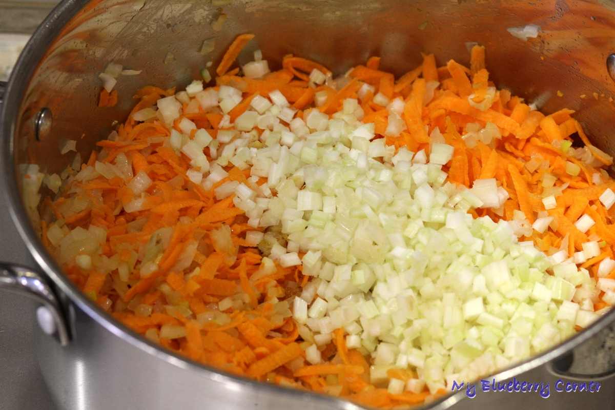 Cebulę obrać i posiekać. Marchewki obrać i zetrzeć na tarce o dużych oczkach. Trzy łodygi selera naciowego pokroić w drobną kostkę. W dużym garnku rozgrzać oliwę, na niej podsmażyć przeciśnięty przez praskę czosnek. Dodać cebulę, zeszklić ją.