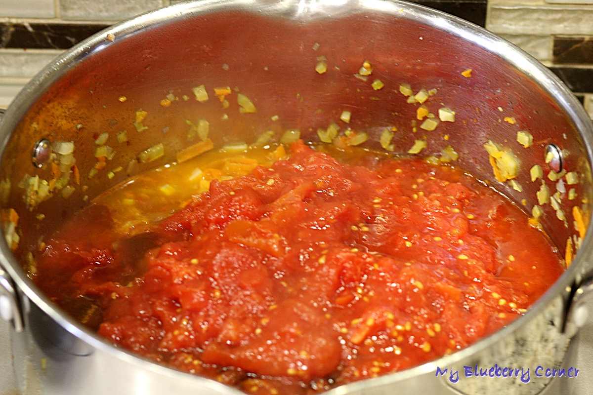 Dołożyć pastę z ancho chili i przeciśnięte przez palce pomidory ze słoika.