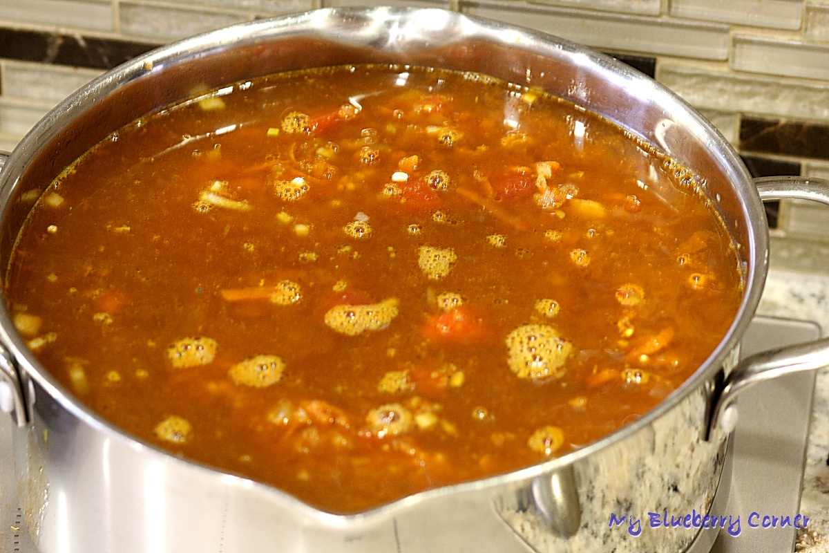 Zupa z pomidorami i pęczakiem – rozgrzewająca, aromatyczna i sycąca. Staram się, żeby w moim domu jedzenie się nie marnowało. Po zjedzeniu mięsa kurczaka z dania pt. „Kurczę pieczone”, pozostałości, łącznie z kostkami, skórami i ziołami zalałam wodą i gotowałam na małym ogniu przez 4-5 godzin. Na tym bulionie powstała bardzo apetyczna zupa. Tak skomponowanym posiłkiem trafiłam w gust moich bliskich.