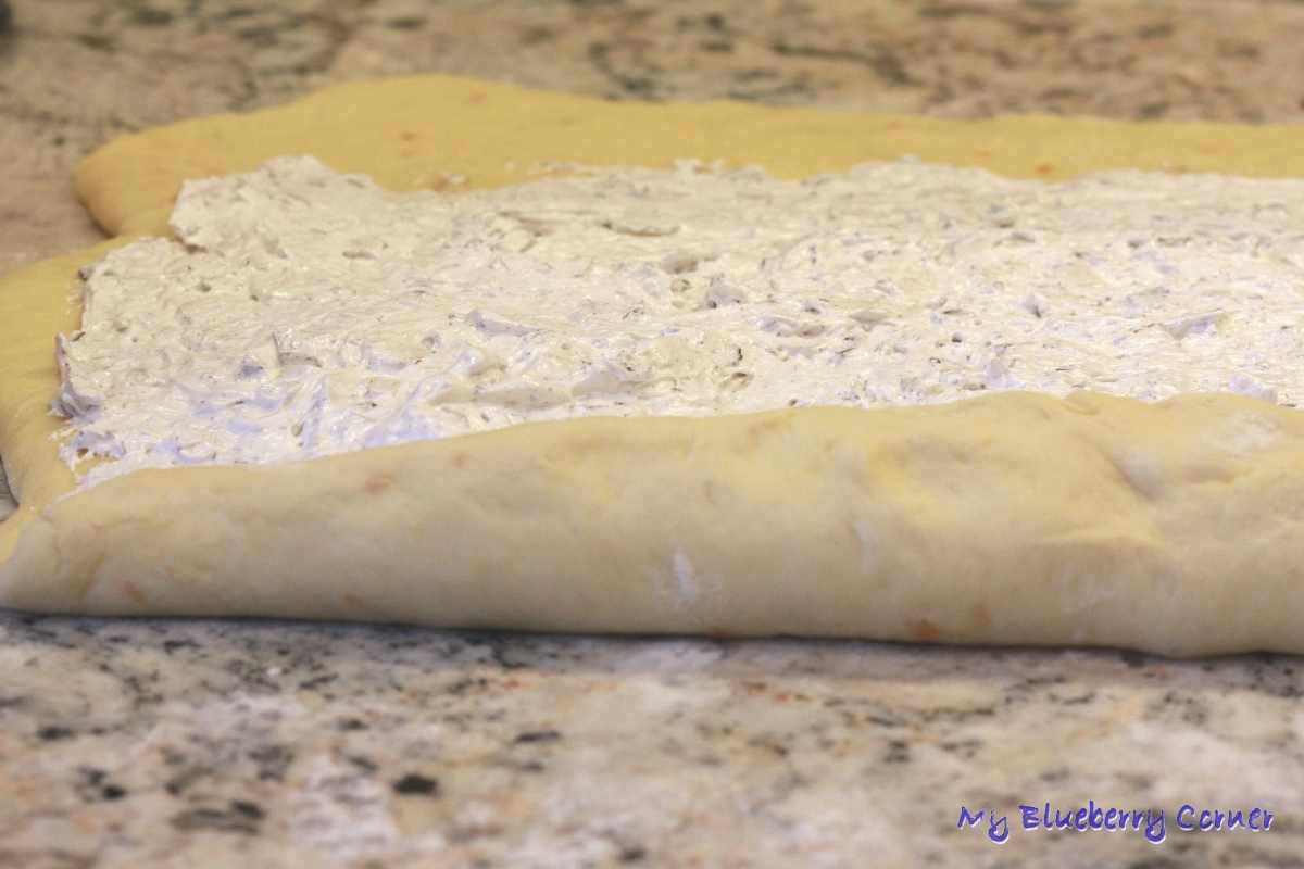 Po wyrośnięciu ciasto wyłożyć na oprószony mąką blat i rozwałkować na prostokąt o grubości ok. 1 cm. Na placku rozłożyć nadzienie, zwinąć w rulon po dłuższym boku.