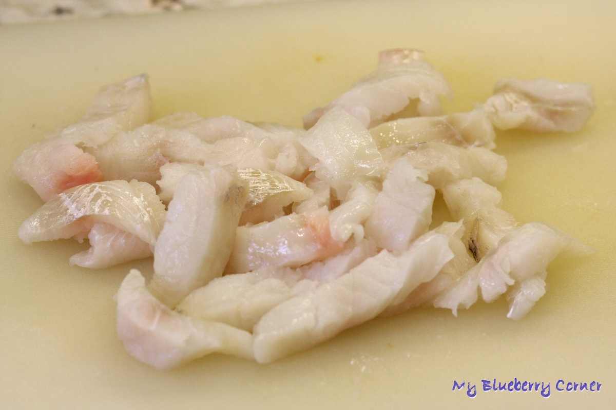 Filety oczyścić z ewentualnych ości, pokroić na mniejsze części.