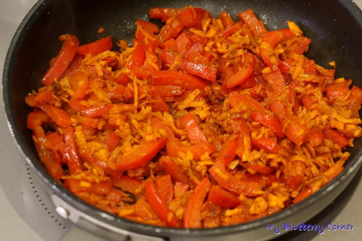 Na patelni rozgrzać oliwę, podsmażyć czosnek. Dodać paprykę i marchewkę, zamieszać, smażyć przez 3 minuty. Dodać obie mielone papryki i smażyć jeszcze przez 1 minutę.