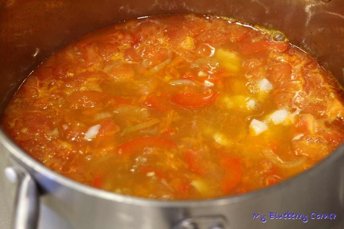 Pomidora sparzyć wrzątkiem, obrać ze skóry i pokroić w dużą kostkę, dodać do garnka.