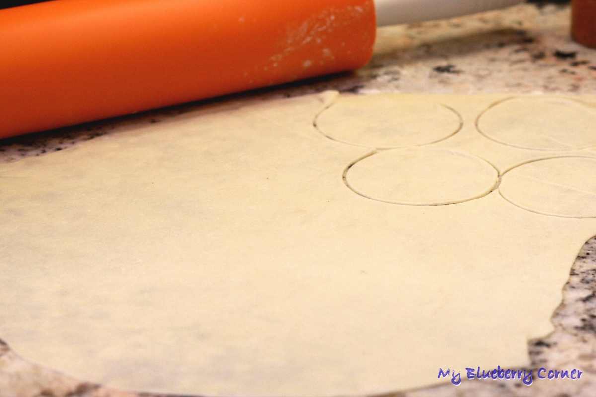 Ciasto na pierogi odcinać małymi porcjami. Każdą porcję cienko rozwałkować, wykrawać krążki o średnicy 7-8 cm.
