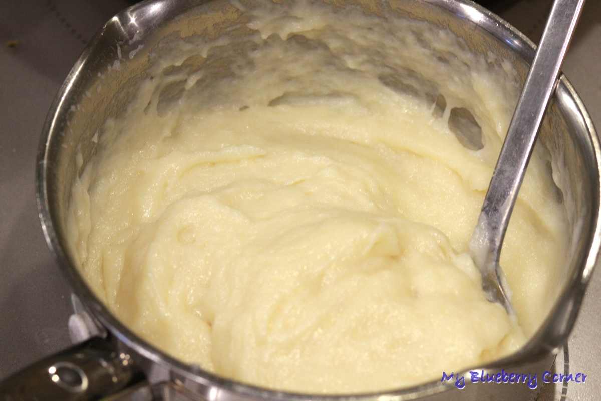 Do pozostałego mleka wsypać cukier, mąkę ziemniaczaną. Wszystko wymieszać, dodać ekstrakt z wanilii i wlać do wrzącego mleka. Mieszać, aż powstanie gęsty, gładki budyń. Wyłączyć.