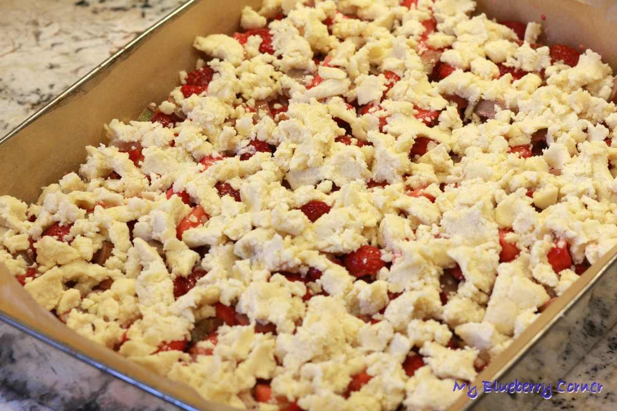 Owoce: Truskawki i rabarbar pokroić na drobne kawałki. Dodać mąkę ziemniaczaną, cukier i sok z limonki. Zamieszać.