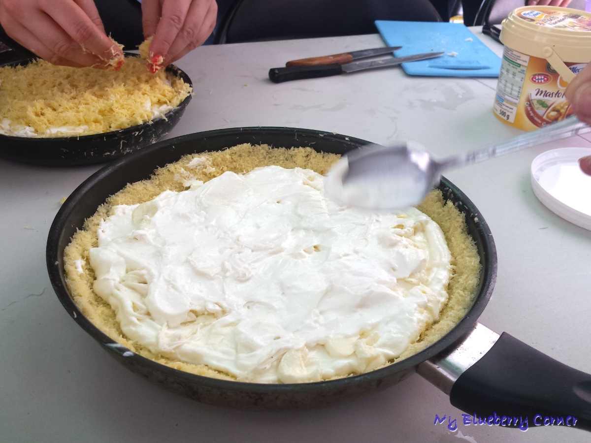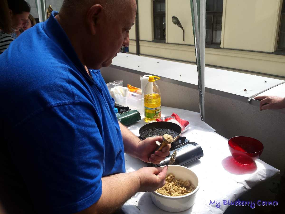 Warsztaty zaczęliśmy od przygotowania podpłomyków z paprykową pastą muhammara. Zagniecione drożdżowe ciasto, wałkowaliśmy na cienkie placki, smarowaliśmy je domową pastą muhammara i smażyliśmy na suchej patelni.
