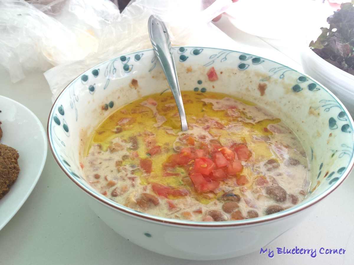 Kolejnym daniem był ful z bobu. W Syrii używa się bób suszony i następnie gotowany (jak fasola). Ful szczególnie przypadł mi do gustu. Jego głównymi składnikami jest bób (my używaliśmy bobu z puszki), sok z cytryny, tahini (pasta sezamowa) i pomidory.