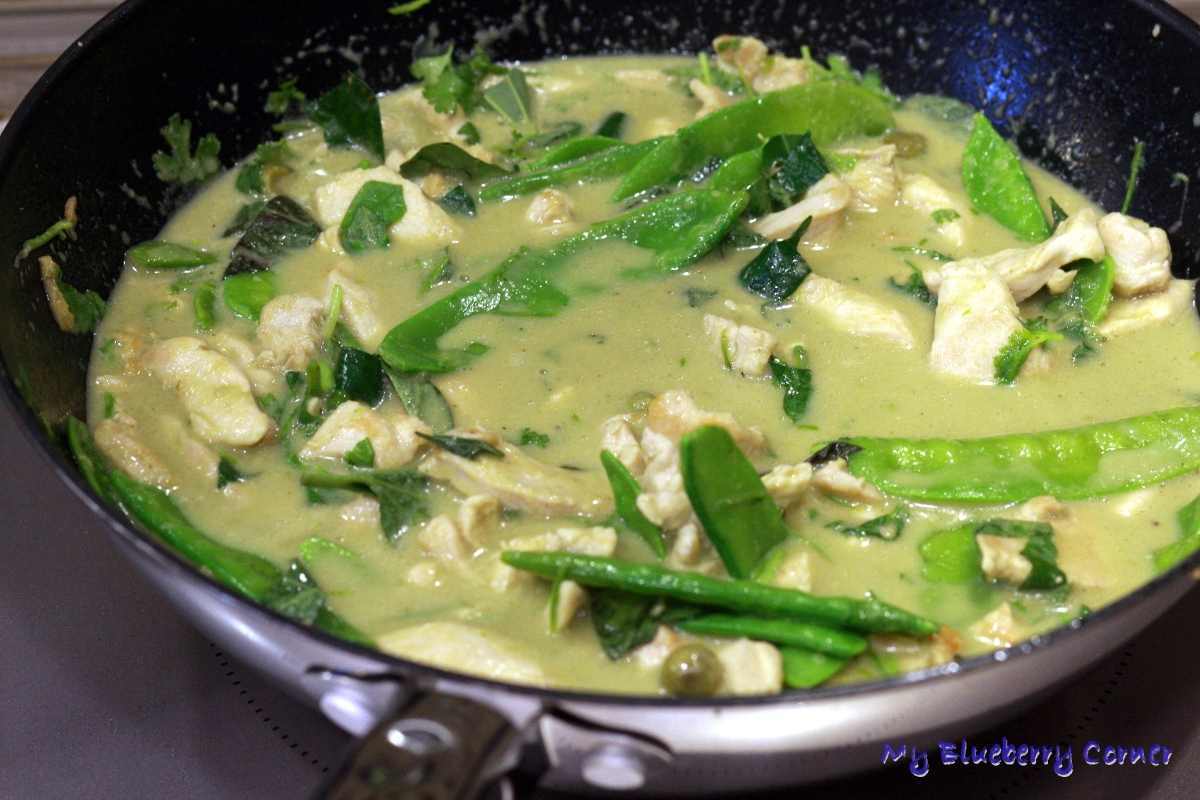 Czasem w naszych sklepach z orientalną żywnością można kupić zielsko z różnych stron świata, tylko trzeba wiedzieć z czym to się je. Do tajskiego curry dodałam polską, białą paprykę i działkowy groszek cukrowy. Całość komponuje się wyjątkowo aromatycznie i pysznie. Oczywiście zielone, tajskie curry można przygotować bez dodatku orientalnego zielska, ze składników dostępnych w naszych sklepach.