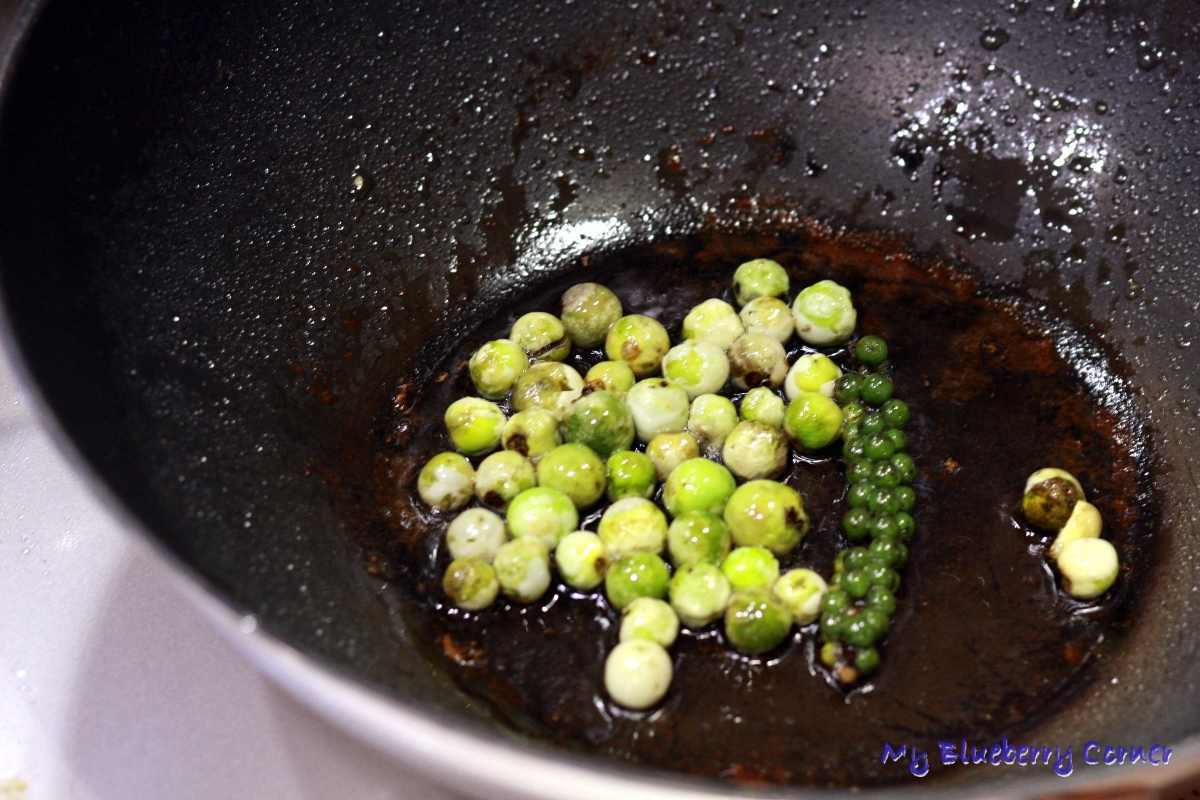 Do rozgrzanego woka włożyć świeży, zielony pieprz i solanum torvum, podsmażyć.