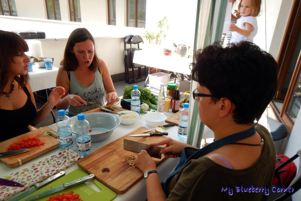 Zaczęliśmy od przygotowania jalanżi – faszerowanych liści winogron. Myślałam sobie – znam to danie, najadłam się go na greckich wyspach i w tureckich kurortach – to było miłe zaskoczenie, bo jalanżi to zdecydowanie inny smak. Zaczęliśmy od tego dania, bo po zawinięciu farszu w liście, musiało się długo gotować.