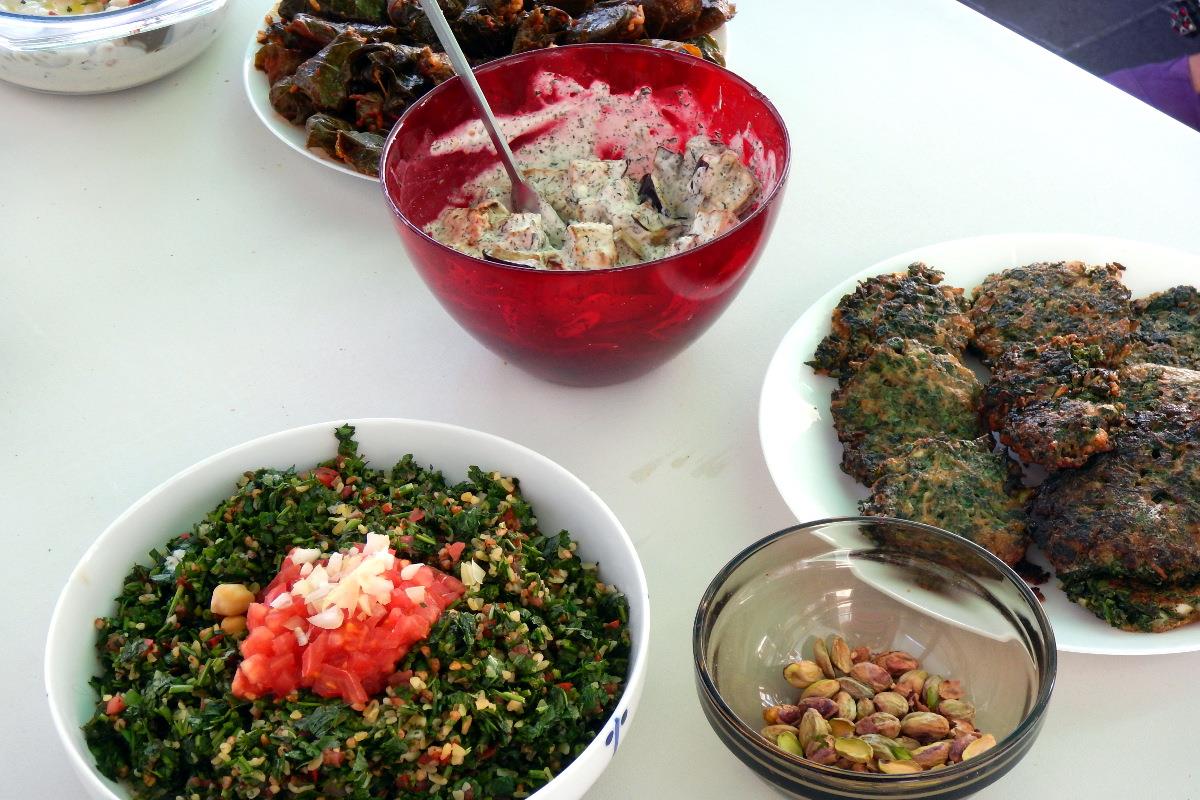 W tym czasie przygotowaliśmy kolejne danie: placki z pietruszki – ejjeh. Placki z pietruszki, bo głównym składnikiem jest natka pietruszki, a do tego mnóstwo aromatycznych ziół i przypraw. Placki mają zupełnie nieoczywisty smak.