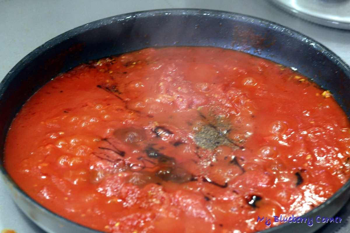Dodać pokrojone lub rozgniecione w dłoni pomidory ze słoika wraz z zalewą, zagotować. Posolić i popieprzyć do smaku, dodać ocet balsamiczny.