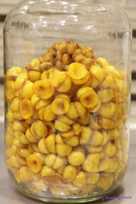 Do słoja przełożyć miąższ owoców i 2 pełne łyżki pestek. Całość zalać spirytusem i wodą, zamknąć i odstawić na 4-5 tygodni w ciemne miejsce.