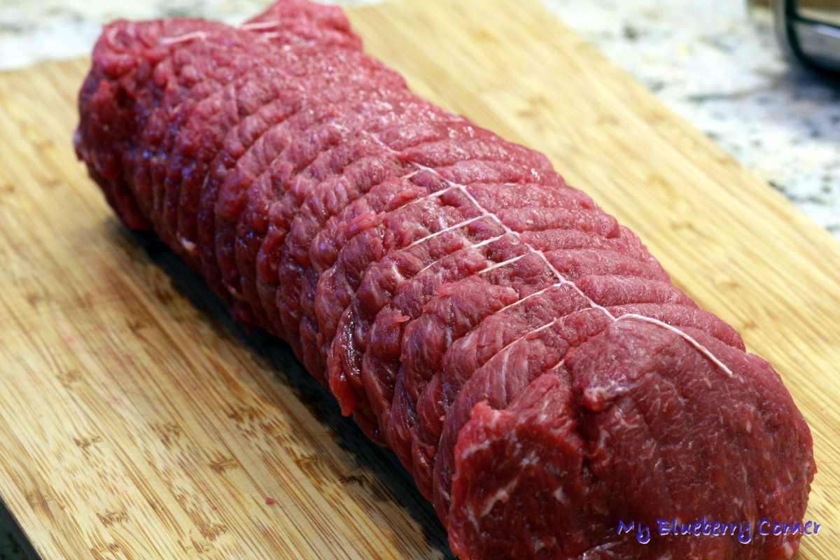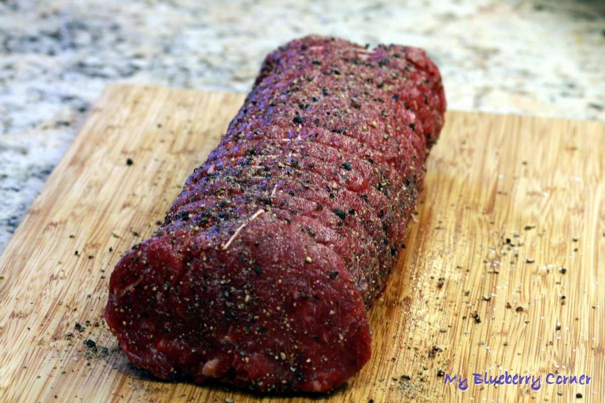 Kilka godzin (2,5-3 godziny) przed planowanym pieczeniem mięso należy wyjąć z lodówki, żeby osiągnęło temperaturę pokojową. Rostbef opłukać, wytrzeć papierowym ręcznikiem i oczyścić z błon.