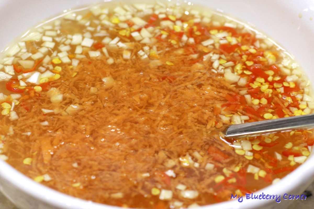 Podstawą tego sosu jest dobrej jakości sos rybny, ale pozostałe składniki (czosnek, ocet lub sok z limonki, cukier i papryczka chilli) też są ważne. Najważniejszy jest balans smaku, czyli odpowiednia słodkość, słoność, kwaśność i ostrość przygotowywanego sosu. Mój sos zrobiłam na podstawie wskazówek przyjaciółki Thanh z Wietnamu. Jako własny akcent, do sosu dodałam 1 łyżkę drobno startej marchewki. Roznoszący się zapach sosu przywołuje wspomnienia z Wietnamu, Ci którzy tam jeszcze nie byli – zechcą do Wietnamu pojechać (lub chociaż wybrać się do Wietnamskiej knajpy).