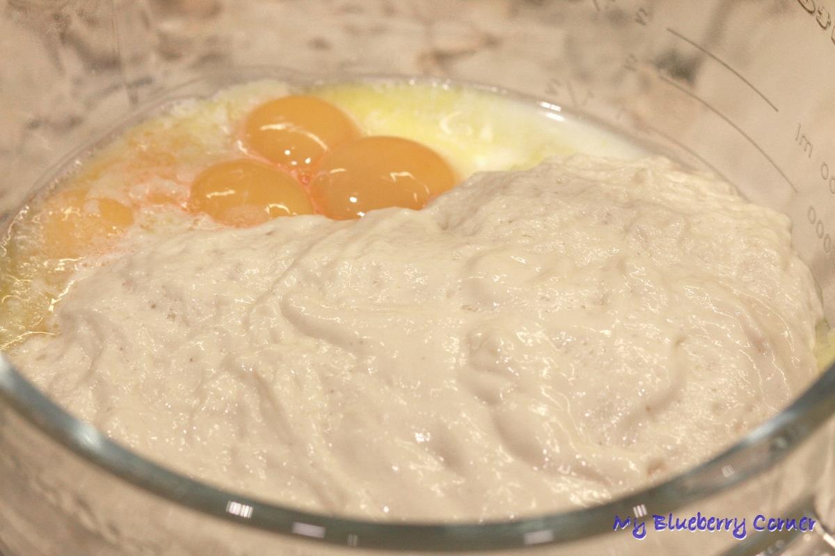 Masło roztopić i przestudzić. Do miski wlać ciepłe mleko, wsypać mąkę, cukier i ziemniaki. Dodać masło, żółtka, spirytus, aromat arakowy i zaczyn.