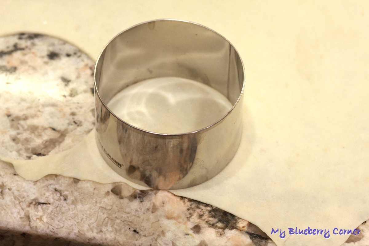 Z ciasta wałkować cienkie placki, podsypując delikatnie mąką. Metalowym pierścieniem lub szklanką wycinać krążki.