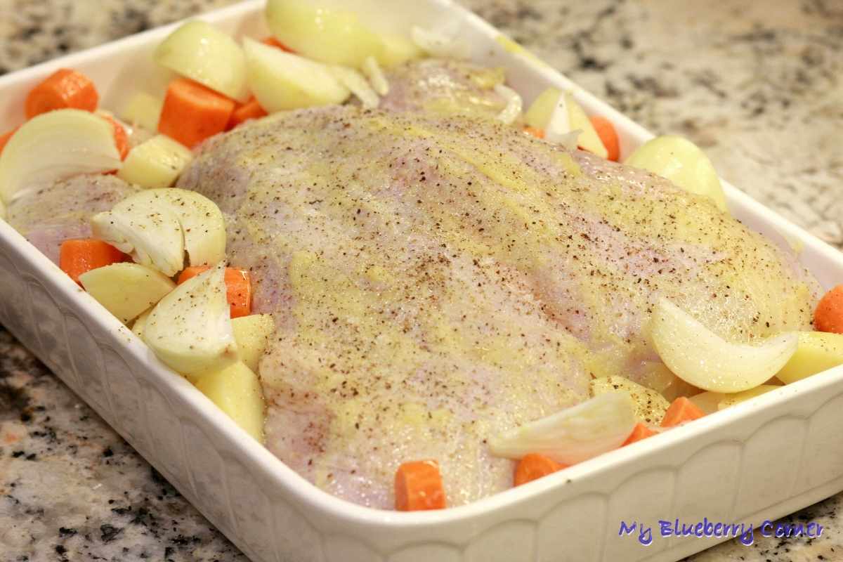 Kuraka przełożyć do naczynia, wierzch nasmarować pozostałym masłem, na wierzch zetrzeć skórkę z jednej mandarynki. Dookoła ułożyć marchewkę, cebulę i ziemniaki. Wszystko przyprawić solą i pieprzem, nakryć folią aluminiową.