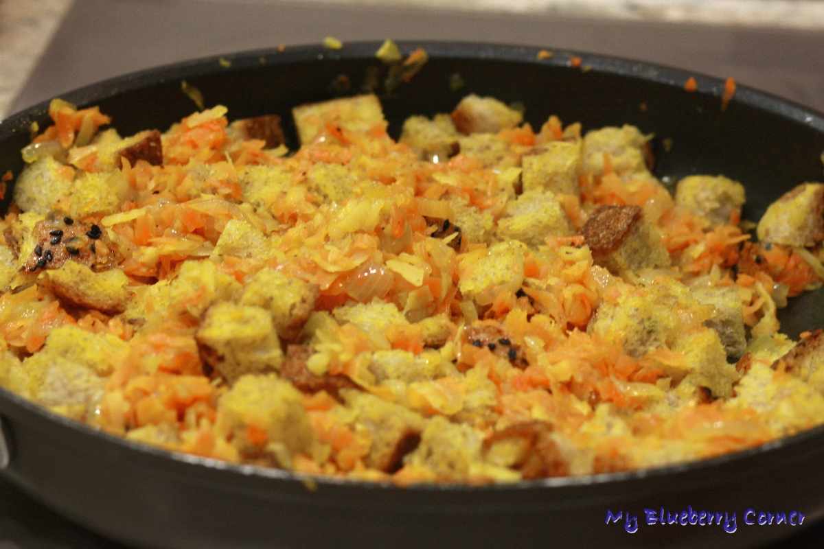 Chleb pokroić w średnią kostkę, dodać do warzyw.