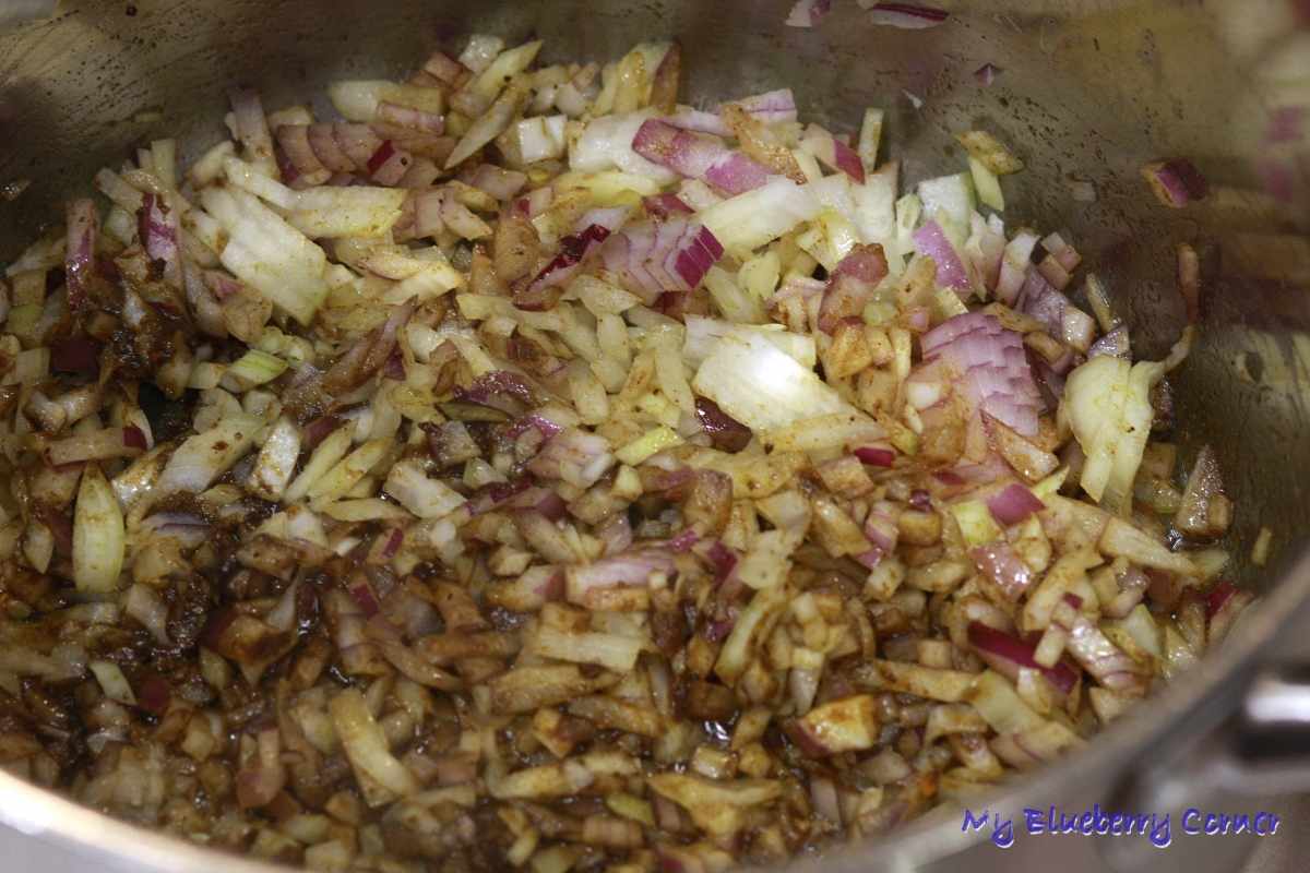 Gdy kmin zacznie ciemnieć dodać 2 łyżki oleju oraz cebulę.