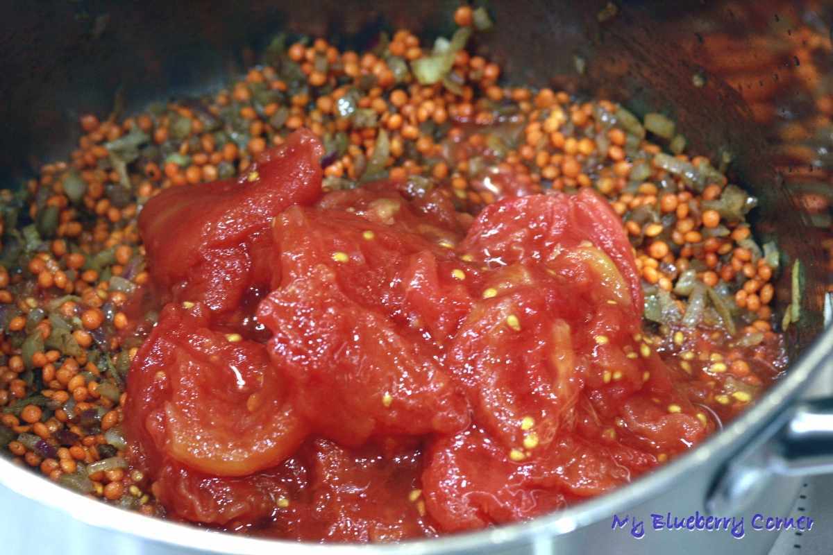 Smażyć 5 minut na średnim ogniu. Po tym czasie dodać soczewicę, pomidory wraz z zalewą oraz bulion.