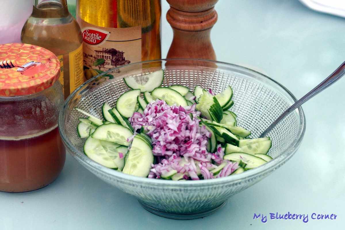 Pokrojone ogórki posolić, wymieszać, odstawić na 10 minut. Po tym czasie odlać z ogórków powstały sok. Cebulę pokroić w drobną kostkę, dodać do ogórków.