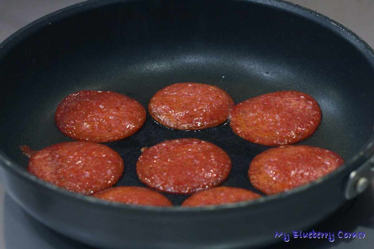 Mozzarellę zetrzeć na tarce o grubych oczkach, kiełbasę pepperoni podsmażyć z obu stron (pepperoni można użyć na surowo, ale podczas podsmażania kiełbasa straci sporo tłuszczu).