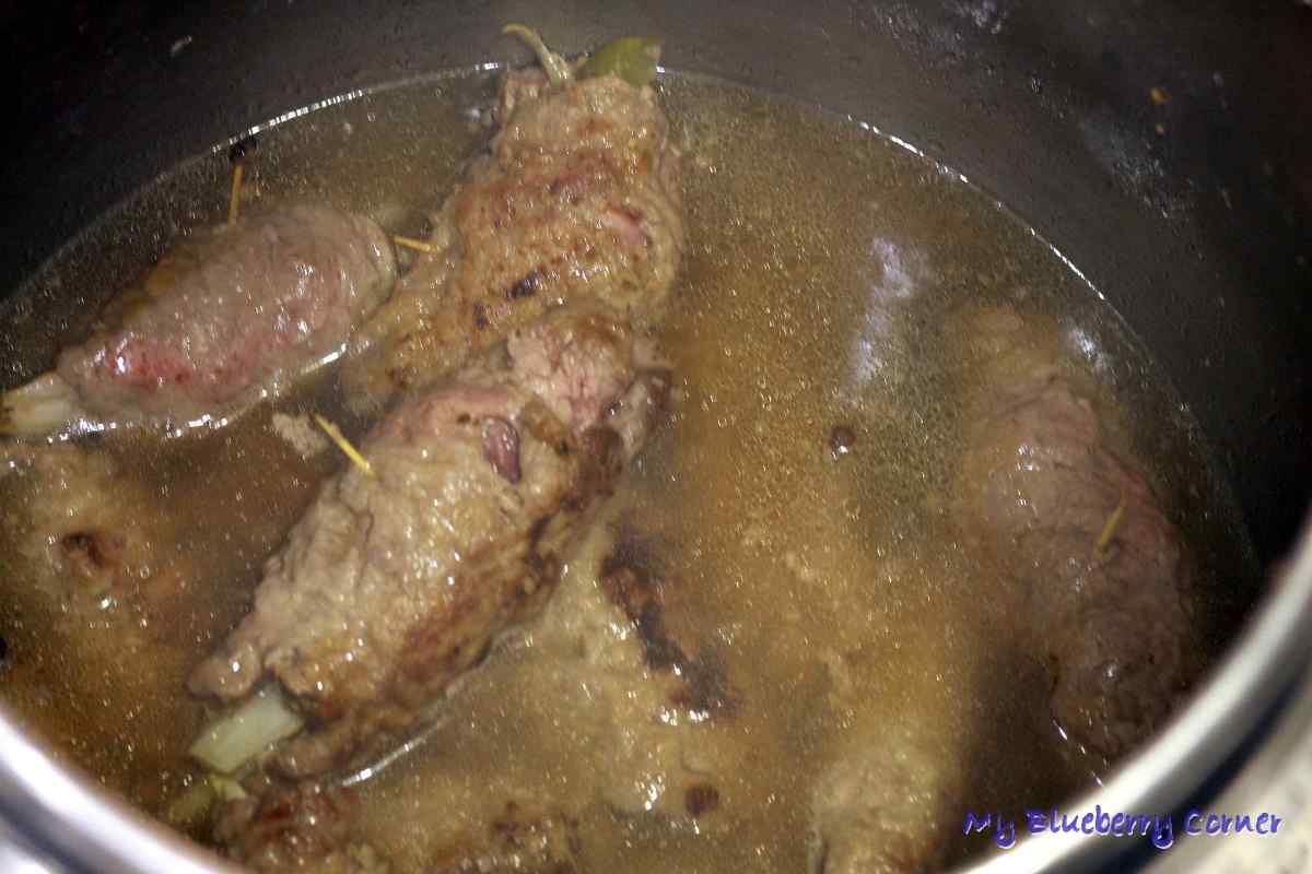 W garnku lub szybkowarze zagotować wodę wraz z przyprawami, do niej przełożyć wszystkie podsmażone rolady.