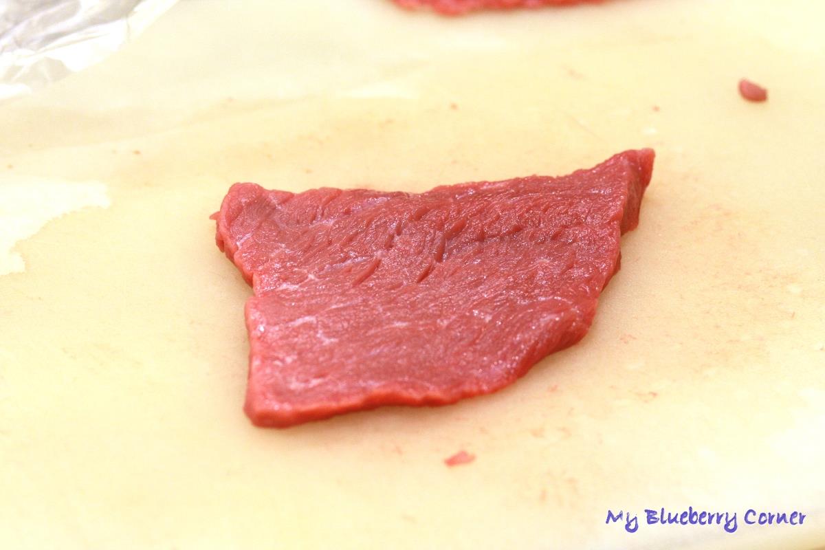 Mięso pokroić w ½ cm plastry w poprzek włókien.