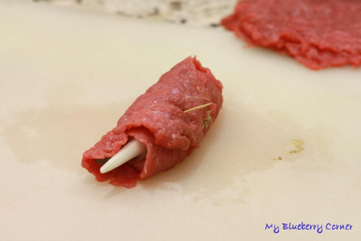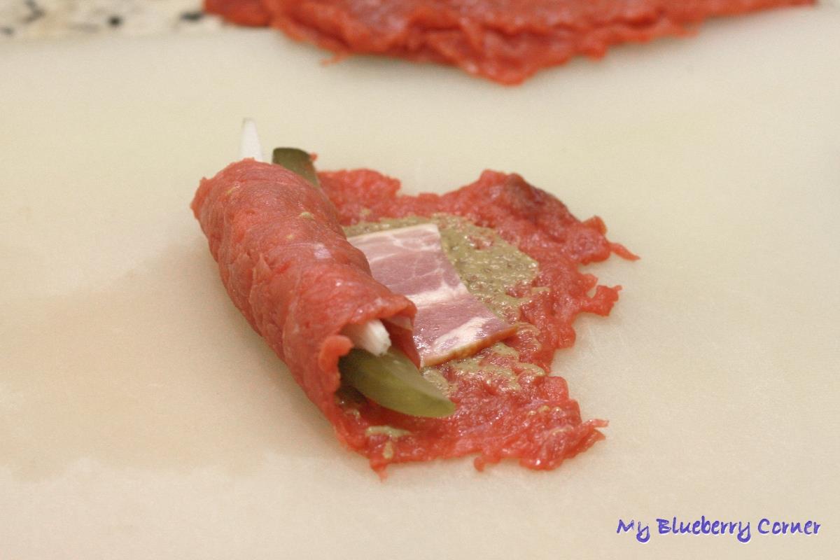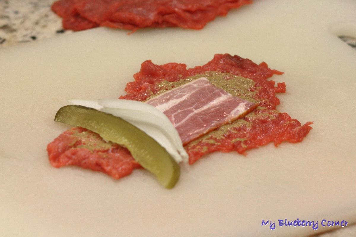 Ogórki i cebule pokroić wzdłuż na tyle części ile mamy plastrów mięsa. Na każdym plastrze rozsmarować ½ łyżeczki musztardy, na tym położyć odpowiedni plasterek boczku, na brzegu położyć kawałek cebuli i ogórka. Kawałki mięsa ciasno zawinąć w rulony, spiąć wykałaczkami.