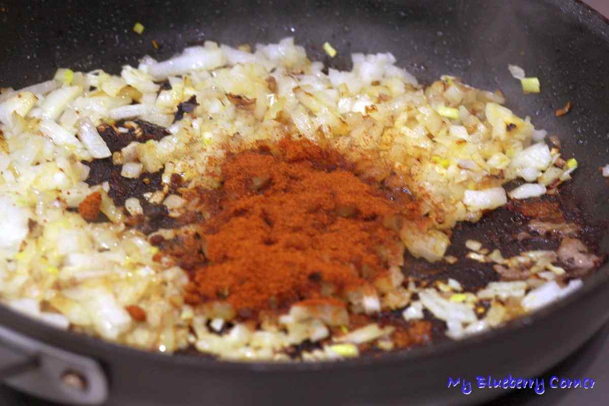 Cebulę pokroić w drobną kostkę, zrumienić ją na tłuszczu po smażeniu mięsa, na koniec dodać paprykę w proszku, lekko przesmażyć, zalać 1 łyżką wazową wody z garka, przemieszać i wszystko przełożyć do garnka (szybkowaru).